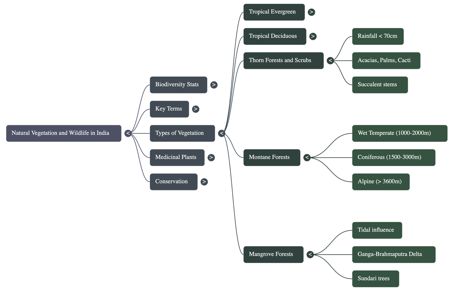 - Environment: Heavy rainfall areas (>200 cm) with a short dry season (Western Ghats, Island groups, Assam, Tamil Nadu coast).