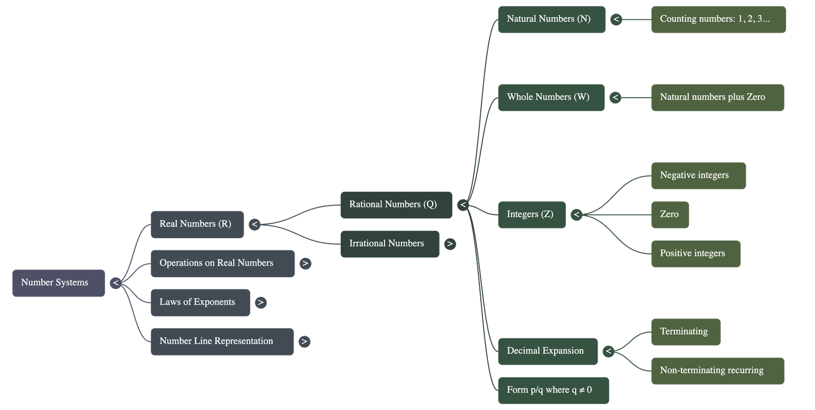 - Rational Numbers (Q): A number 'r' is rational if it can be written in the form p/q, where 'p' and 'q' are integers and q ≠ 0.