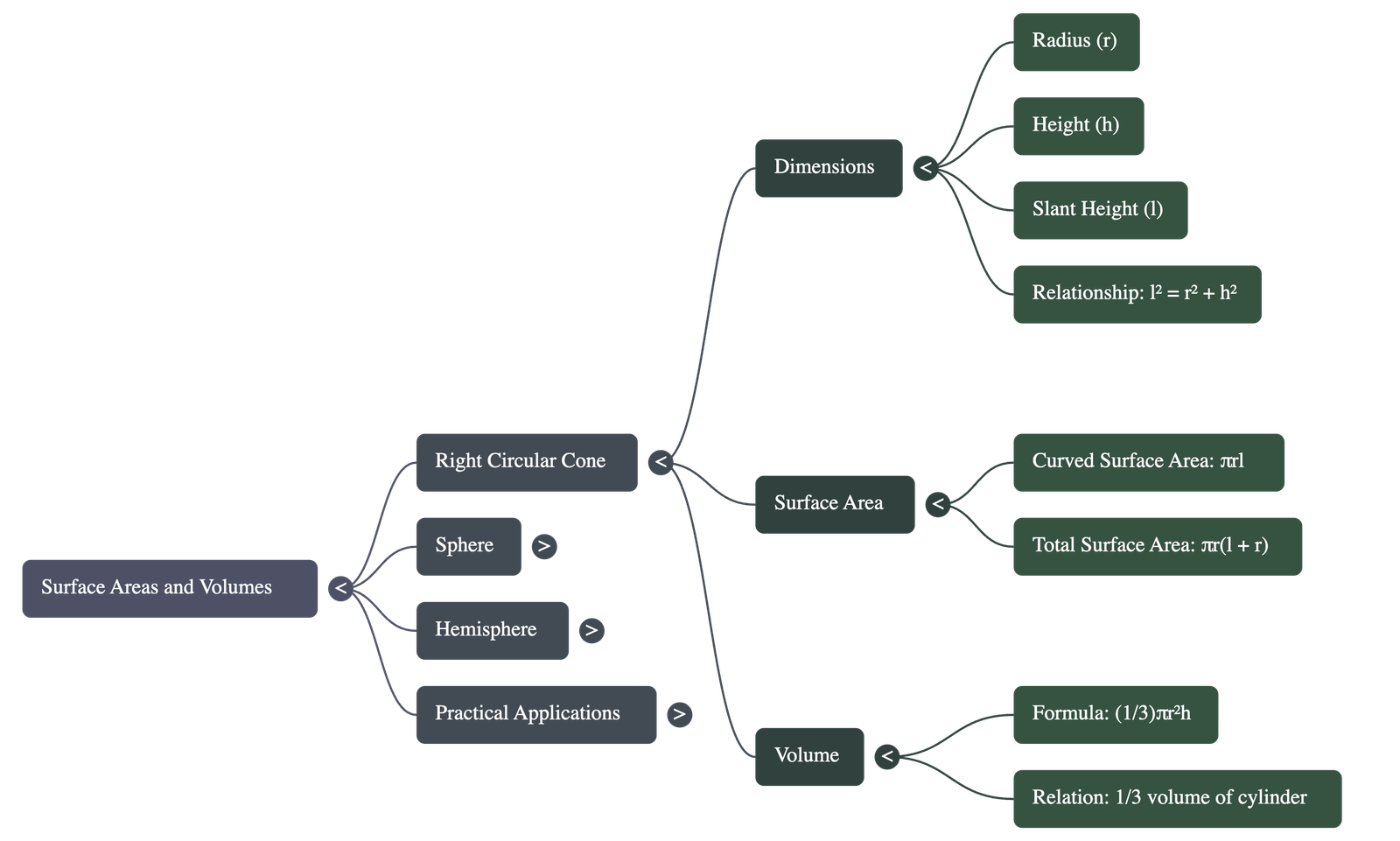 - Slant Height Relationship: The relationship between the height, radius, and slant height is derived using the Pythagoras Theorem: l² = r² + h² or l = √(r² + h²).