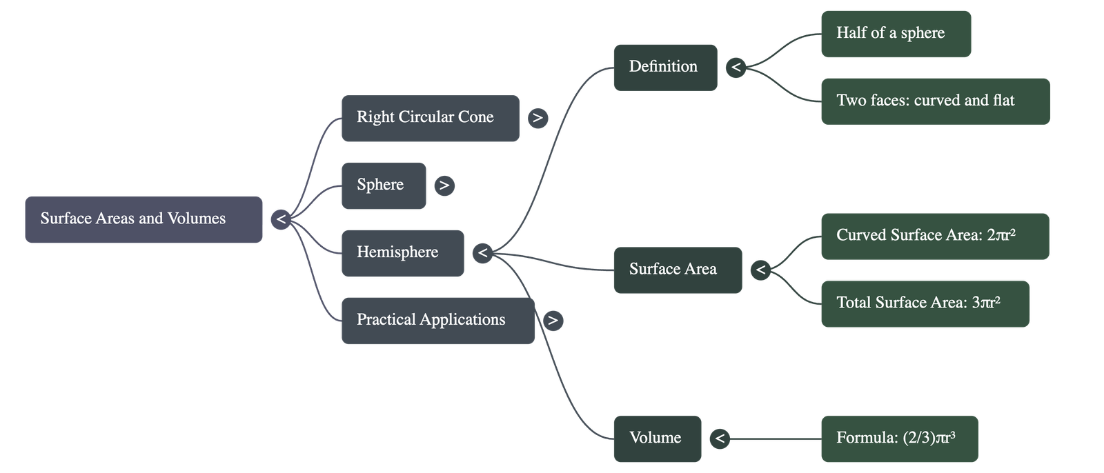 - Volume: The volume of a hemisphere is half that of a sphere: (2/3)πr³.