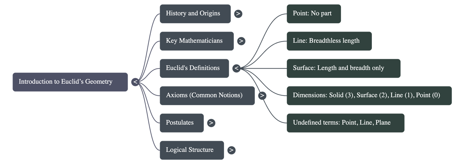- Euclid began his work with 23 definitions, such as: