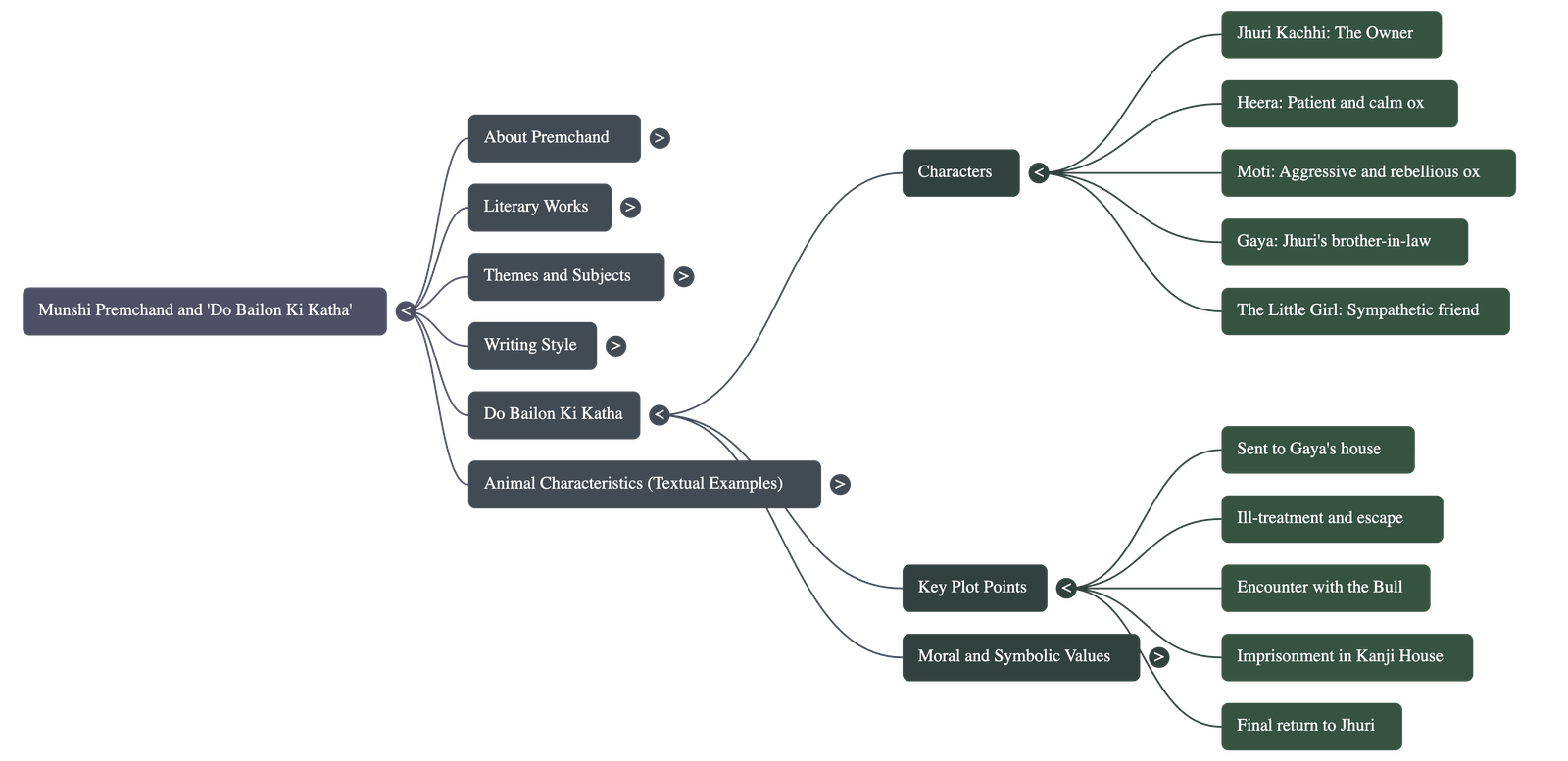 झूरी काछी के पास दो बैल थे, जिनके नाम हीरा और मोती थे। दोनों 'पछाईं' जाति के सुंदर और सुडौल बैल थे। लंबे समय तक साथ रहते हुए उनमें गहरा भाईचारा हो गया था। वे मूक भाषा में एक-दूसरे के विचारों को समझ लेते थे और एक-दूसरे को चाटकर या सूंघकर अपना प्रेम प्रकट करते थे। -