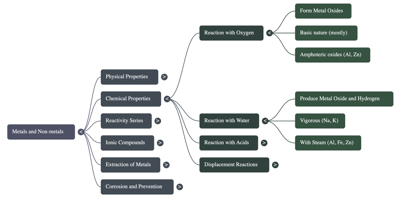 - Metal + Water → Metal Oxide + Hydrogen (Metal oxide may further form Metal Hydroxide).