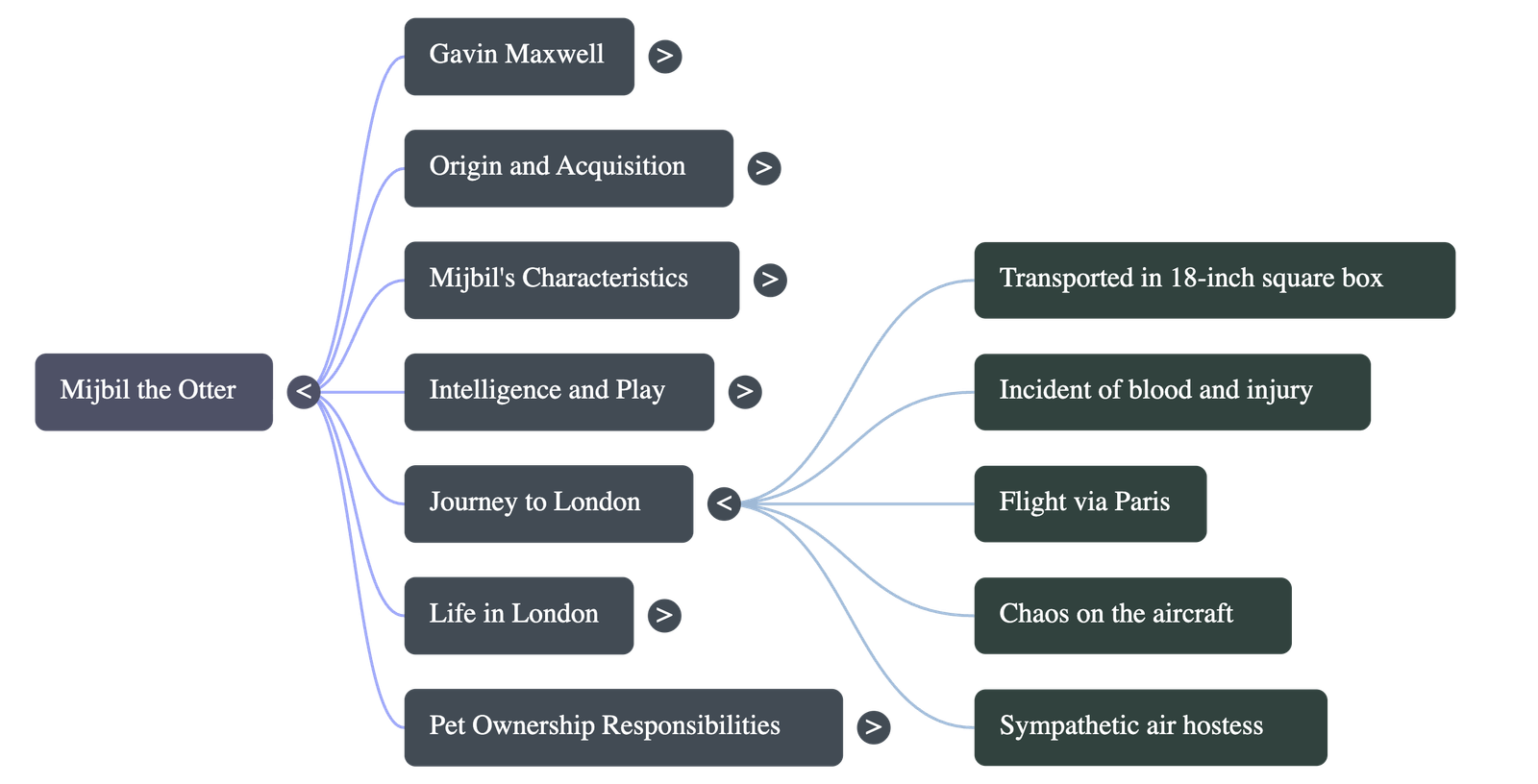 - The Escape: Mijbil escaped the box and ran down the aisle, causing panic. A woman screamed "A rat!" Maxwell tried to catch him but ended up with curry on his face. The air hostess eventually found Mijbil and brought him back to Maxwell. The otter then spent the rest of the flight nuzzling Maxwell's face.