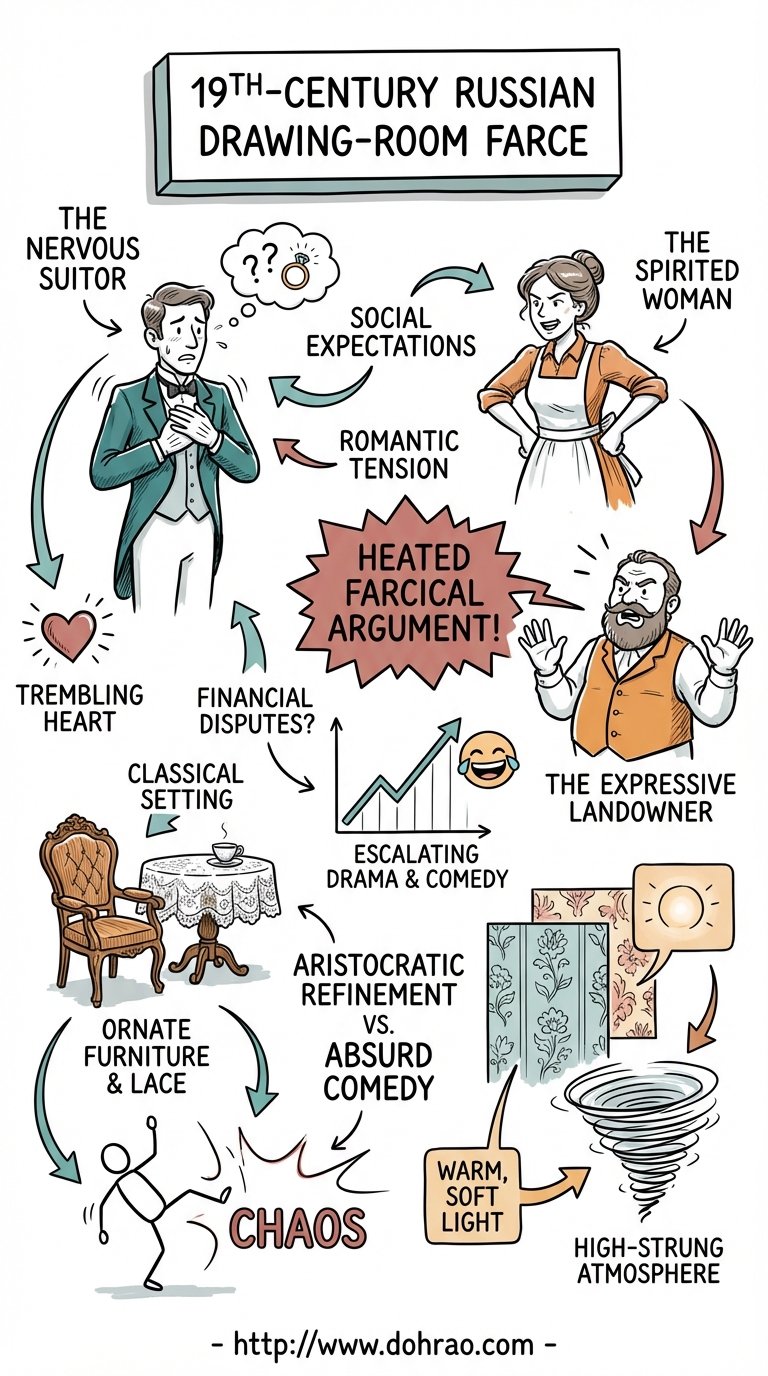 - The Revelation: Still fuming, Chubukov insults Lomov after he leaves, accidentally revealing to Natalya that "the stuffed sausage" had actually come to propose marriage to her.