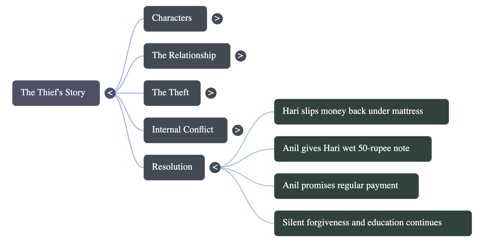 - Forgiveness and Change: The next morning, Anil gives Hari a fifty-rupee note that is still wet. Anil reveals he made money and will now pay Hari regularly, and calmly announces they will start writing sentences. Though Anil clearly knows about the theft, he shows no anger, and Hari smiles at him with genuine, effortless warmth.