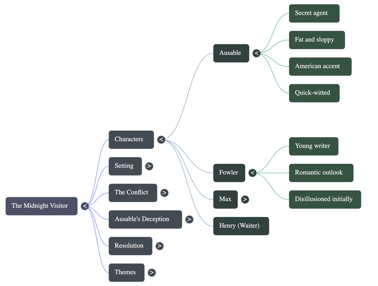 - Unconventional Secret Agent: Fowler, a young and romantic writer, is disappointed upon meeting Ausable, a secret agent who is fat, sloppy, and lacks the mysterious aura typically associated with spies in fiction.