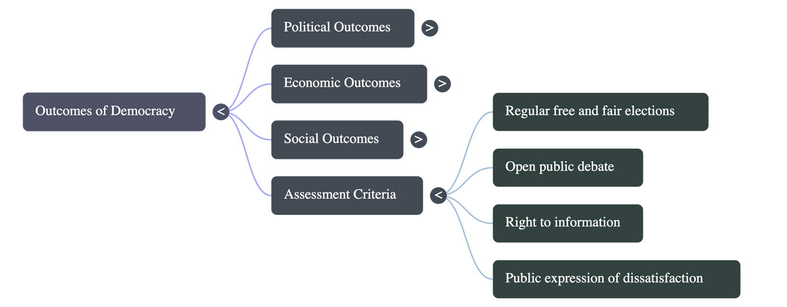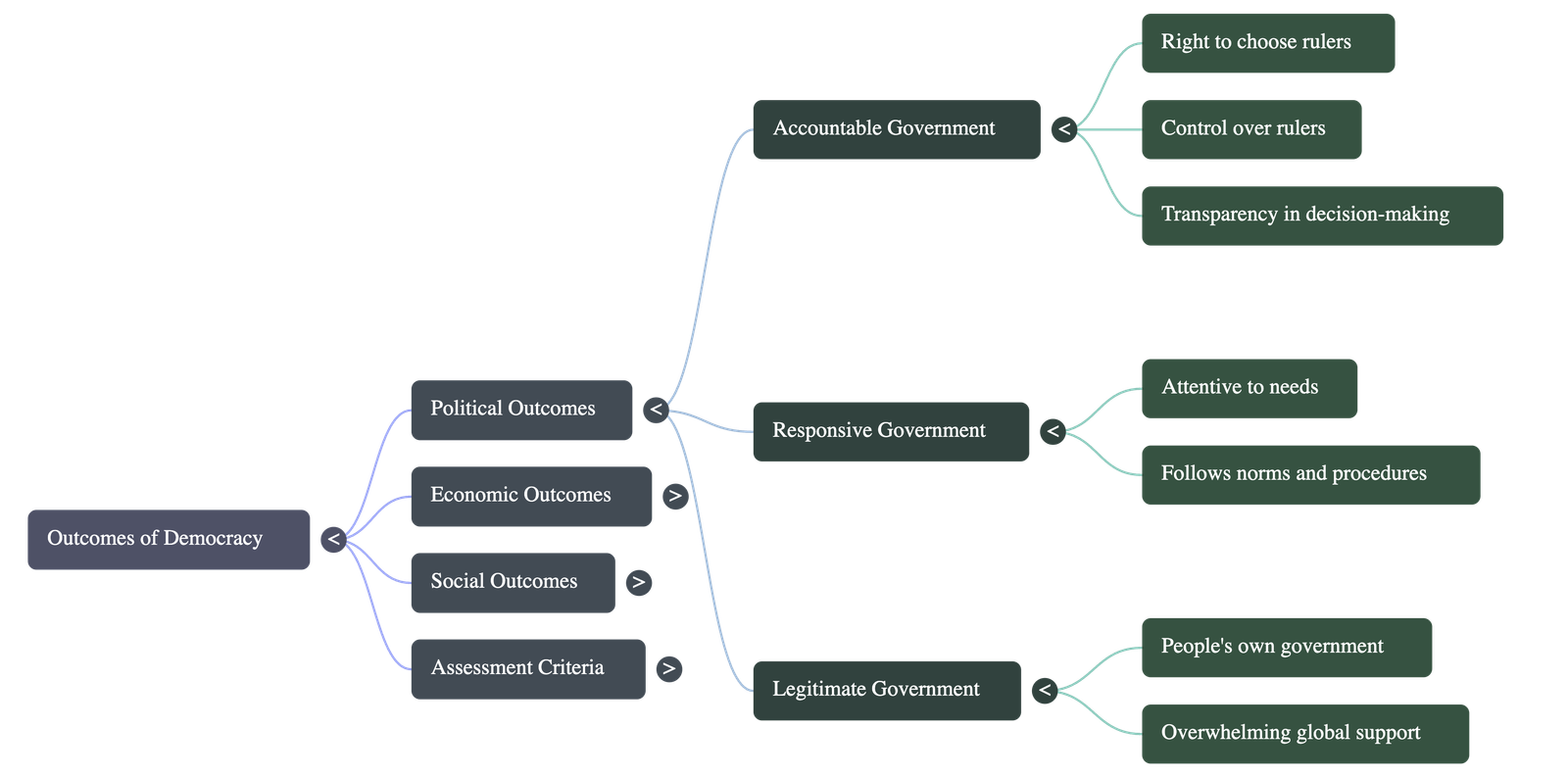 - Legitimacy: This is democracy's strongest outcome. A democratic government is the people’s own government. There is overwhelming support for the idea of democracy worldwide, even in countries without democratic regimes, as people wish to be ruled by elected representatives.