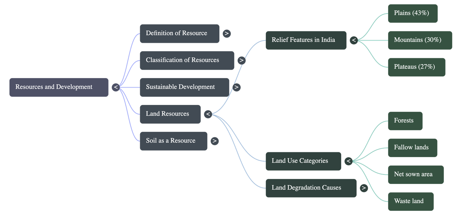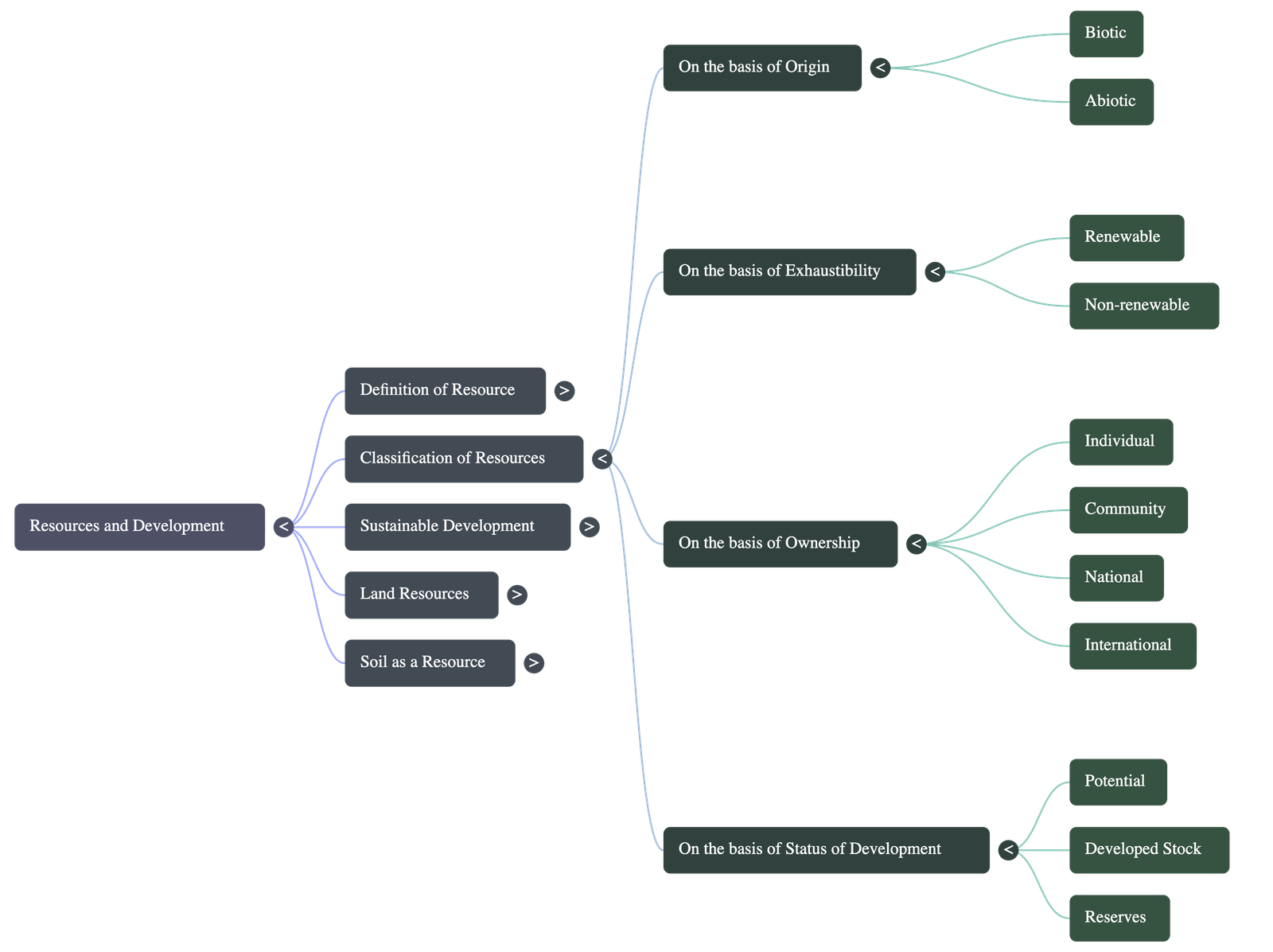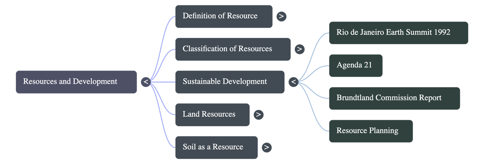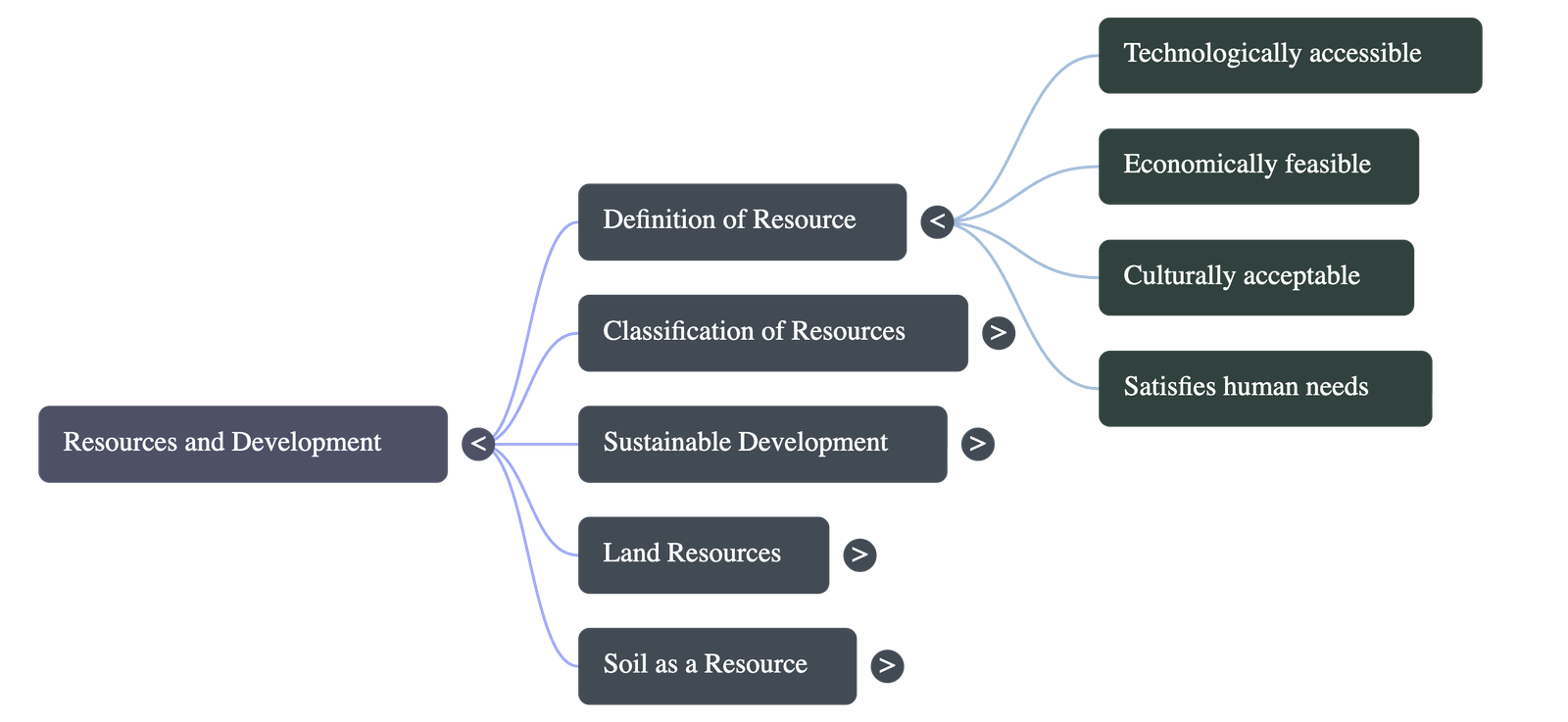 - Nature of Resources: Resources are not free gifts of nature; they are a function of human activities. Humans transform material available in the environment into resources.
