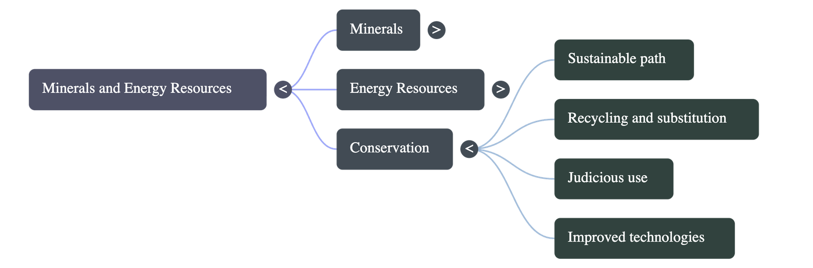 - Conservation Methods: Sustainable use, improved technologies to use low-grade ores, recycling of metals, and using substitutes.