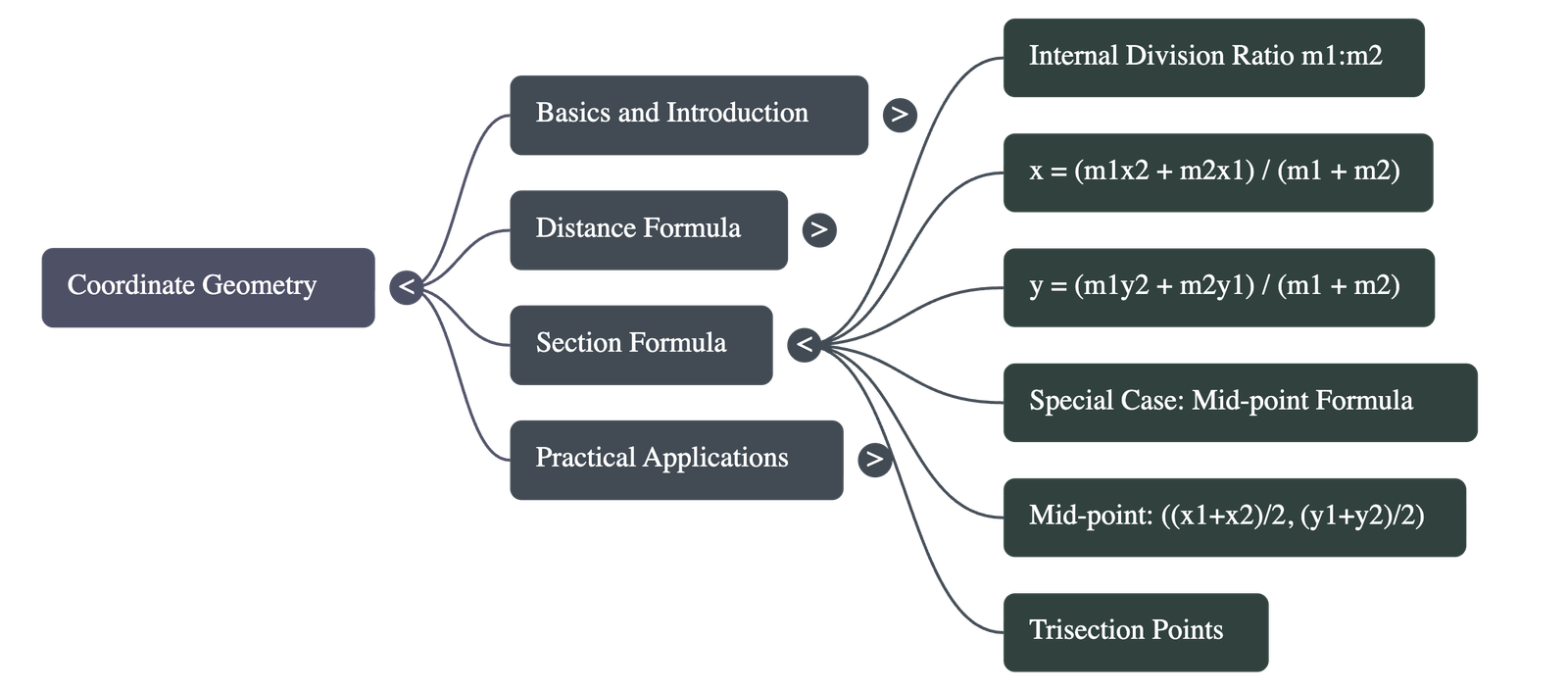 - Section Formula: Finds the point dividing a segment in ratio m1:m2.