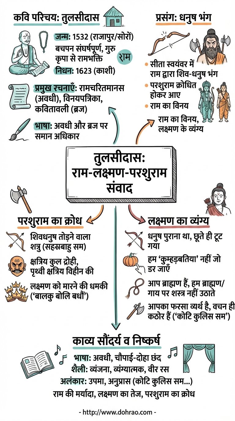 - इस पूरे प्रसंग में लक्ष्मण की वाकपटुता और व्यंग्य शैली दर्शनीय है। जहाँ परशुराम 'वीर रस' और क्रोध में डूबे हैं, वहीं लक्ष्मण मुस्कुराहट और तर्कों से उनका सामना करते हैं।