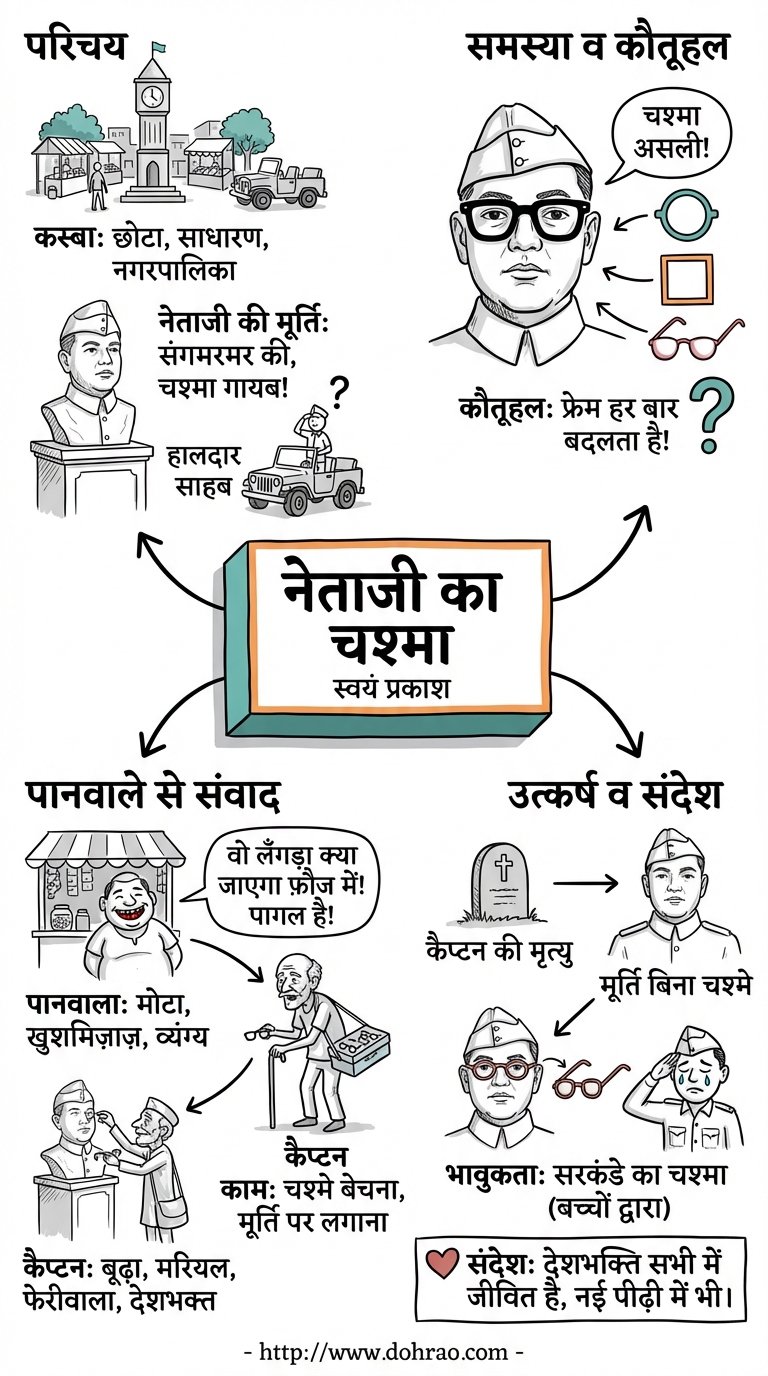 - ➤ वह अपनी दुकान के गिने-चुने फ्रेमों में से एक नेताजी को पहना देता था। जब किसी ग्राहक को वैसे ही फ्रेम की मांग होती, तो वह मूर्ति से उतारकर ग्राहक को दे देता और मूर्ति पर दूसरा फ्रेम लगा देता था।